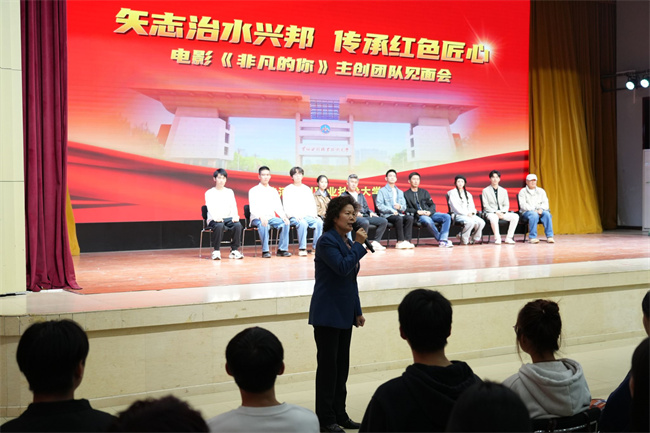 周保平在讲话中指出,学校坚持用心传承好红旗渠精神,把学生精神品格的塑造放在育人工作重要位置,把“立德树人”根本任务落到实处,努力培养更多能扛住艰苦、担起使命的“非凡”水利人才。在学校高质量发展的征程中,一代代黄水人坚守攻坚克难的担当精神、精益求精的工匠精神和甘于奉献的家国情怀,以初心赴使命,以实干显担当。周保平代表学校向电影《非凡的你》主创团队表示诚挚感谢,她强调,主创团队将学校杰出校友吴祖泰的感人事迹搬上银幕,把一段深植于学校血脉中的感人故事,生动地呈现在师生面前,这不仅仅是一次艺术展现,更是一堂鲜活、深刻、极具影响力的“大思政课”,必将点燃师生的精神之火,汇聚成砥砺前行的磅礴力量。她号召全体师生以红旗渠精神为动力,以吴祖泰等杰出校友为榜样,在技能报国的征程中勇担使命,争做新时代卓越“答卷人”。