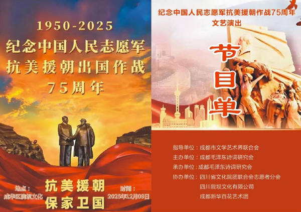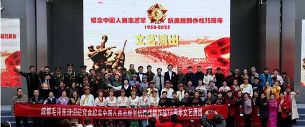 为了铭记历史、弘扬伟大的爱国主义精神,进一步激发广大会员及市民的家国情怀,12月9日,成都毛泽东诗词研究会主办的“纪念中国人民志愿军抗美援朝作战75周年”文艺演出活动,在成都市中心的四川院坝文化广场隆重举行。