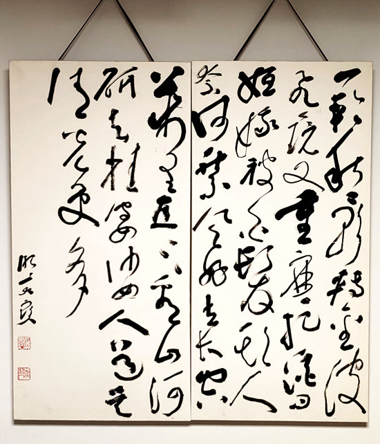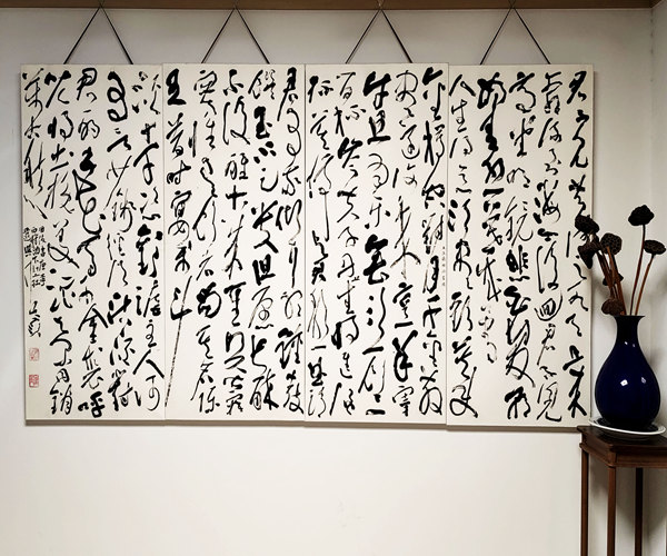 先生工作室置有一幅八尺草书《将进酒》,是为酒后所作。浓墨直取,笔力千钧,或迟涩老辣或一泻千里,纵横恣肆间犹听大珠小珠落玉盘,豪迈激荡,极尽图像美与韵律美。虽是携酒意而挥,却笔法精炼,章法自显,无不于法度之中。