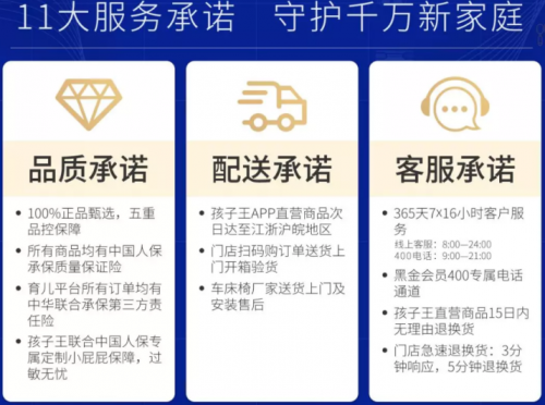 孩子王售后承诺365×7×24小时,6秒极速响应;为黑金会员开通了专属电话通道,零等待即可进入专属客服;孩子王直营商品支持“15日内无理由退换货”,3分钟响应,5分钟退换货;同时,孩子王联合中国人保专属定制红屁屁险,保障宝宝小屁屁健康无忧。